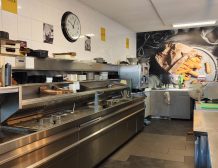 Via een deuropening aan de linkerzijde kom je in een kleine ruimte bestemd voor afhaal. De rechterzijde van de cafetaria is ingericht voor het ter plaatse nuttigen van de diverse menu’s. Helemaal links achterin de verkoopruimte bevinden zich de gescheiden toiletgroepen. Rechts achterin de verkoopruimte (achter de keuken) zit nog een ruime opslagruimte, hier bevindt zich een ruime koel- en vriescel.