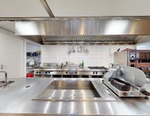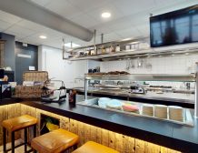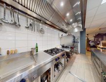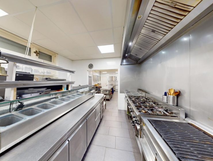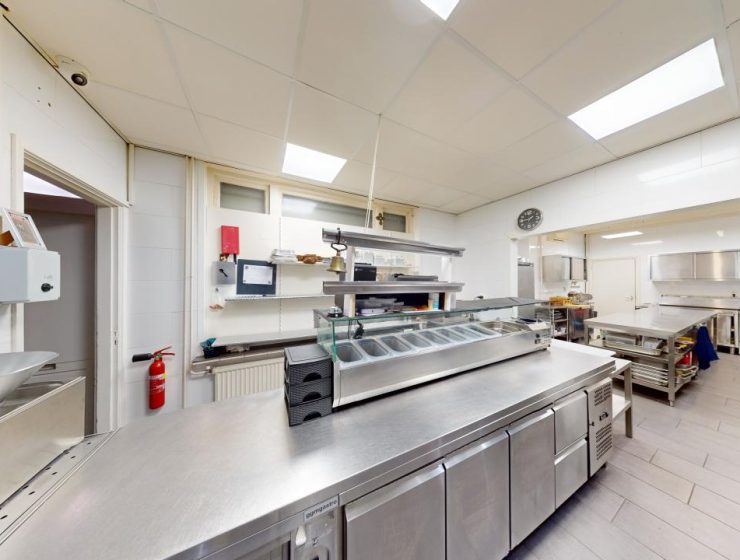 Midden in de zaak is de prachtige grote open keuken geplaatst voorzien van alle benodigde apparatuur, achter de keuken zit nog een ruime opslagruimte, hier bevindt zich een ruime koel- en vriescel.Helemaal rechts achterin de eetwinkel bevinden zich de gescheiden toiletgroepen.